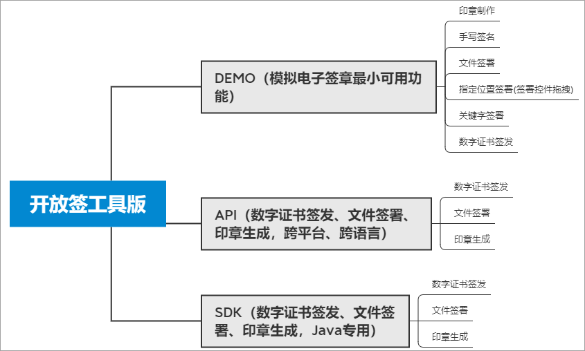 3.2 功能模块说明· API接口(跨平台、跨语言便于任何语言的开发者使用):提供企业印章制作、证书签发、文件签署(指定位置签署、关键字签署)API接口服务。 API接口采用HTTP(S)通讯,JSON报文格式,具有跨平台、跨语言特性,专为各类开发语言用户提供服务,便于其他语言的开发者快速集成和应用电子签名; · demo(以最小可用的方式应用电子签章电子合同):(1)前端:主要实现在线签署、手写签名、电子印章生成、拖动位置签署等可视化的操作体验; (2)后端:使用API接口或SDK为前端提供服务。 · SDK(便于Java开发者快速应用电子签章):SDK能力同API接口,便于使用java语言开发的用户直接集成使用。