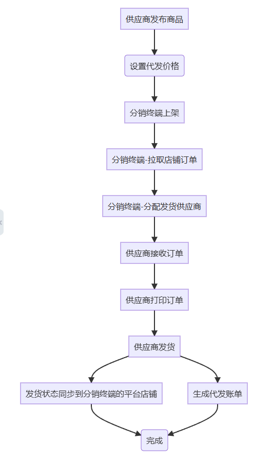 电商SCM供应链分销代发系统是为电商供应链端开发的一套供应商分销代发业务系统,主体业务流程是:分销终端从各平台店铺导入(拉取)订单、厂家(供应商)从系统后台打单发货。