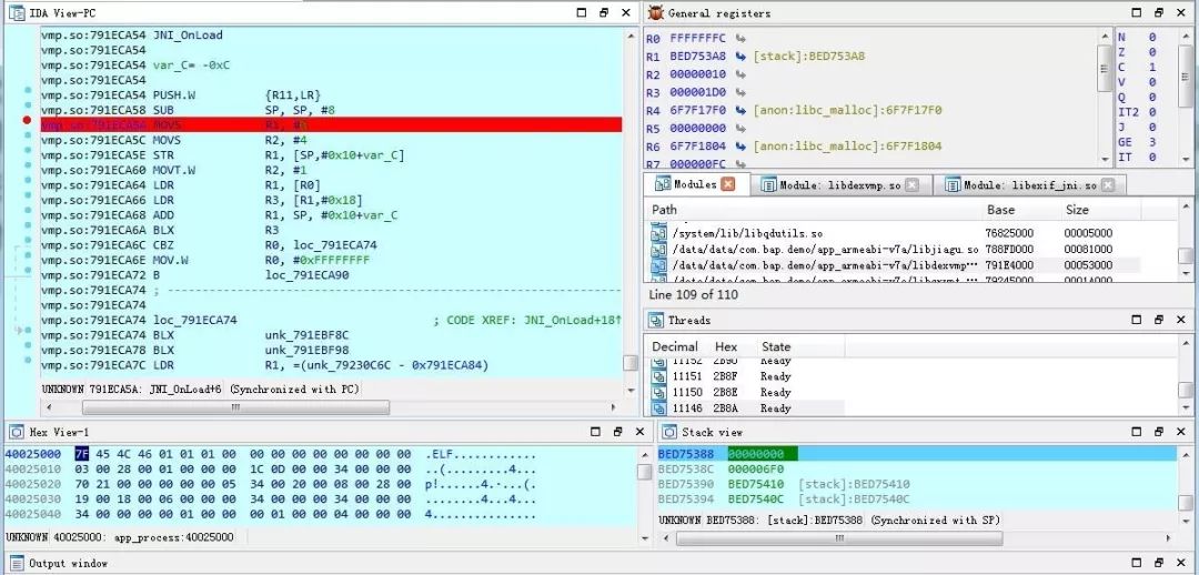 解决:对So进行混淆可以一定程序上对抗静态分析,加大逆向的难度,但是逆向者还是可以看到汇编代码。一般安全厂商使用So加壳加固,对代码段进行加密压缩处理,在So加载时自动调用壳代码进行解密。 缺陷:动态调试,在加载完壳后解密位置dump内存。 使用IDA对So文件进行动态调试,能够看到内存的内容以及寄存器的值。