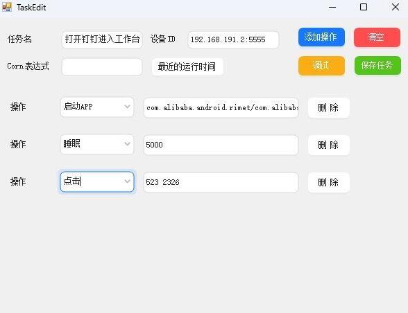 操作和参数[td]| 操作 | 参数示例 | 备注 | | 点击 | 500 500 | 输入 x y 坐标,坐标可通过调试打开显示坐标显示,有些手机需要开启模拟点击才能运行 | | 滑动 | 540 1300 540 500 1000 | 5个数字,表示从哪里滑动到哪里, 最后一个是时间,时间越长滑动越慢 | | 按键 | KEYCODE_HOME(或3) | 字符或者数字 可搜索安卓keyevent 找到对应的键码 | | 启动APP | com.alibaba.android.rimet/com.alibaba.android.rimet.biz.LaunchHomeActivity | 启动app需要获取到app的Activity 自行搜索 安卓启动xxx app | | 睡眠 | 500 1500(或 500) | 单位毫秒 填一个数字就是固定睡眠,两个数字,随机在两个值之间时长 | | 自定义命令 | 无 | 自定义cmd指令,可以运行控制台执行 | corn表达式自行搜索corn表达式 任务示例- 任务说明