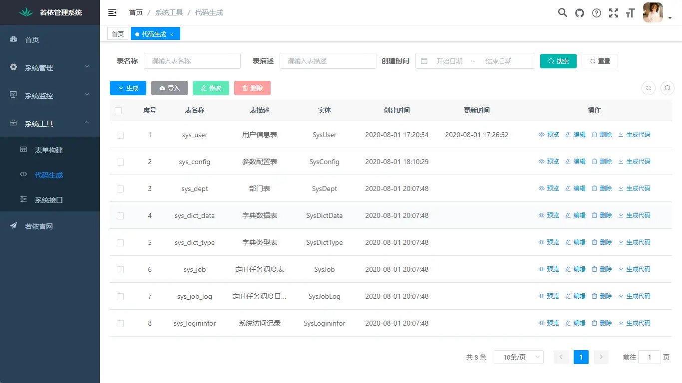 若依是一套全部开源的快速开发平台,毫无保留给个人及企业免费使用。 - 前端采用Vue、Element UI。