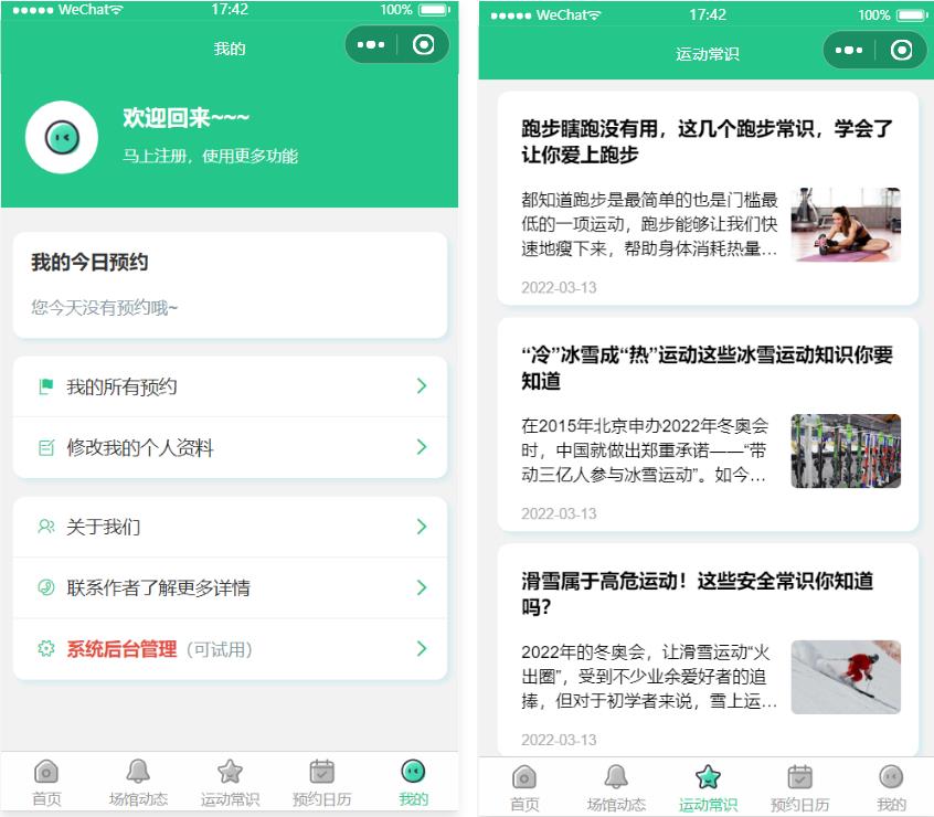 程序前后端完整代码,包括场馆动态,运动常识,羽毛球场地预约,足球场地预约,篮球场地预约,