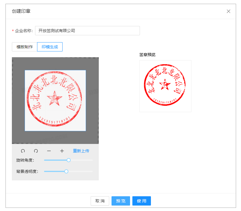 (2)印模生成:1.在白纸上加盖印章;2.扫描上传进行自动透明化抠图;3.生成透明印章。