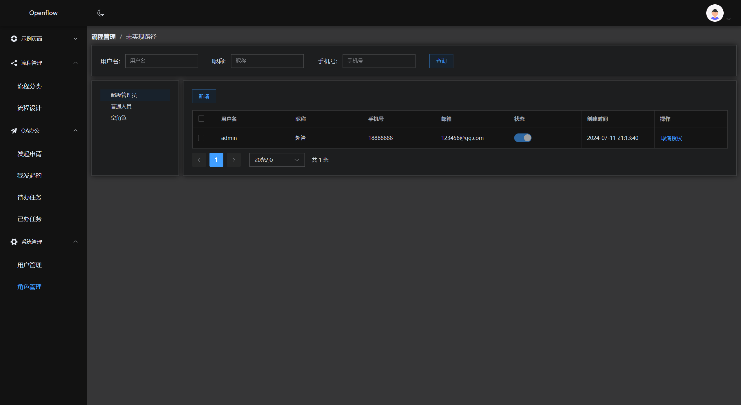 开发环境springboot 2.7.18 , java 17 , warm-flow , satoken , hutool , mybatis-plus , easy-trans 功能介绍系统模块