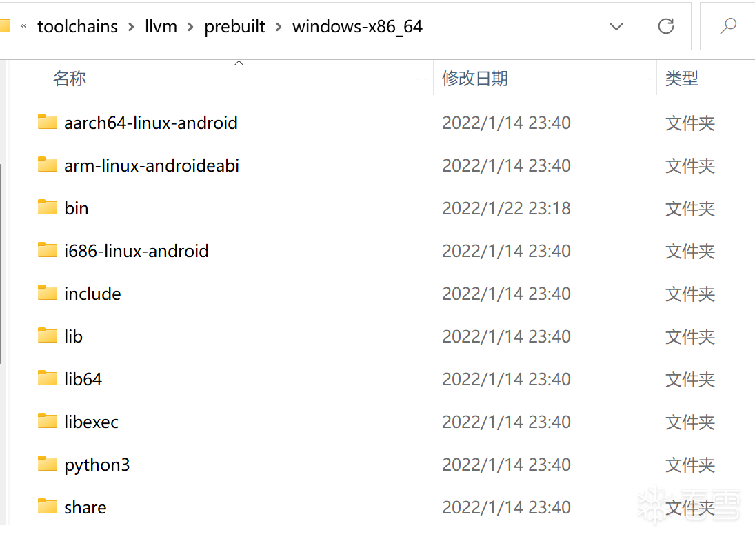 编译好后out/install/windows-x86/clang-dev中对应的就是NDK中的toolchainsllvmprebuiltwindows-x86_64部分: