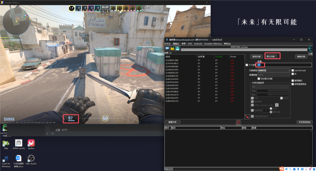 进入游戏按~键调出控制条,输入sv_cheats 1开启允许调试 然后输入mp_roundtime_defuse 60 让游戏设置为60分钟一局(下局会生效的) 然后输入bot_stop 1和bot_dont_shoot 1分别使人机停止移动和停止射击 1.3找自己坐标打开幽络源专属CE,可在此链接获取(附使用教程)=> https://blog.csdn.net/qq_29928661/article/details/142047910?fromshare=blogdetail&sharetype=blogdetail&sharerId=142047910&sharerefer=PC&sharesource=qq_29928661&sharefrom=from_link 在CE中打开CS2,如图: