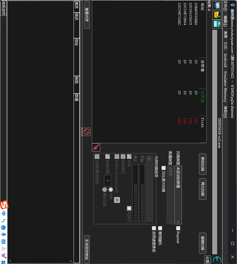 2.2总结FOV视角由上可总结出我们的FOV视角纵向地址和横向地址分别为 client.dll+1A0A2A8 client.dll+1A0A2AC 第三步:找敌人坐标地址3.1找敌人血量CE搜索四字节100,因为敌人血量100 然后随便找个敌人给他来一刀,不要刀头,然后切换为减少的数值,点击再次扫描,如图