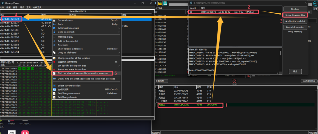 对保存下来的地址右键找出是什么改写了这个地址,然后Show Disa....,然后右键地址点击Find out what...,如图