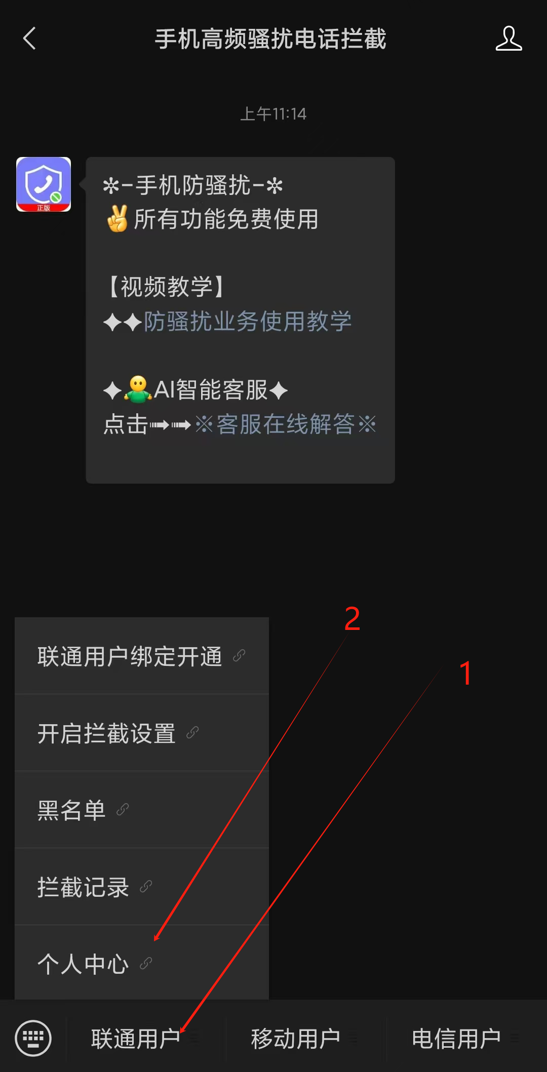 简短流程为:关注公众号→登录手机号→订购拦截套餐(0元)→设置拦截方式→开启成功 详细流程: 一.微信搜索 手机高频骚扰电话拦截 关注公众号,进入公众号后可看到三大运营商,以我的联通为例,点击联通