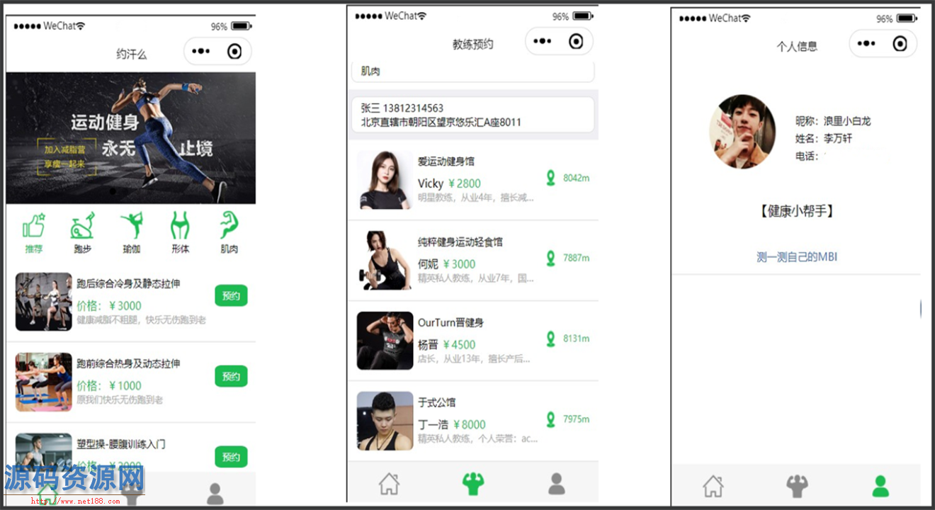 一款健身预约小程序,实现了客户端和服务端的数据交互,具体功能有服务展示,教练展示,