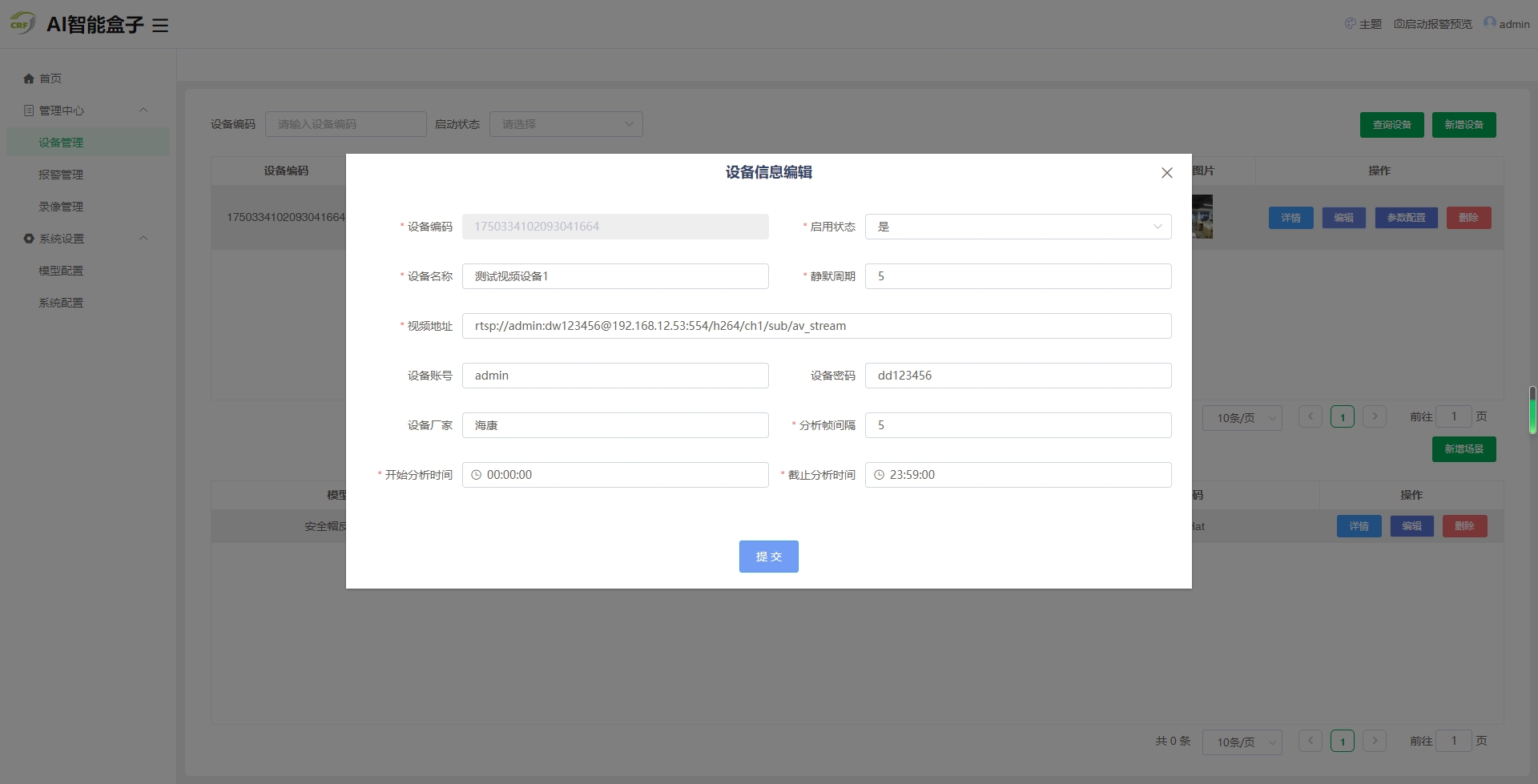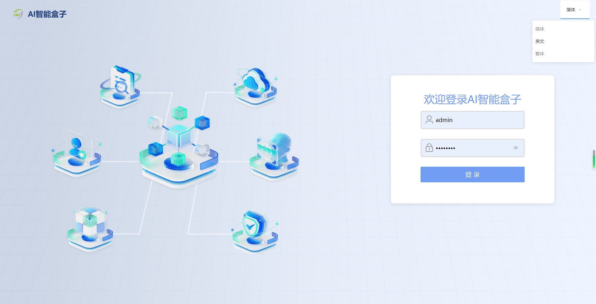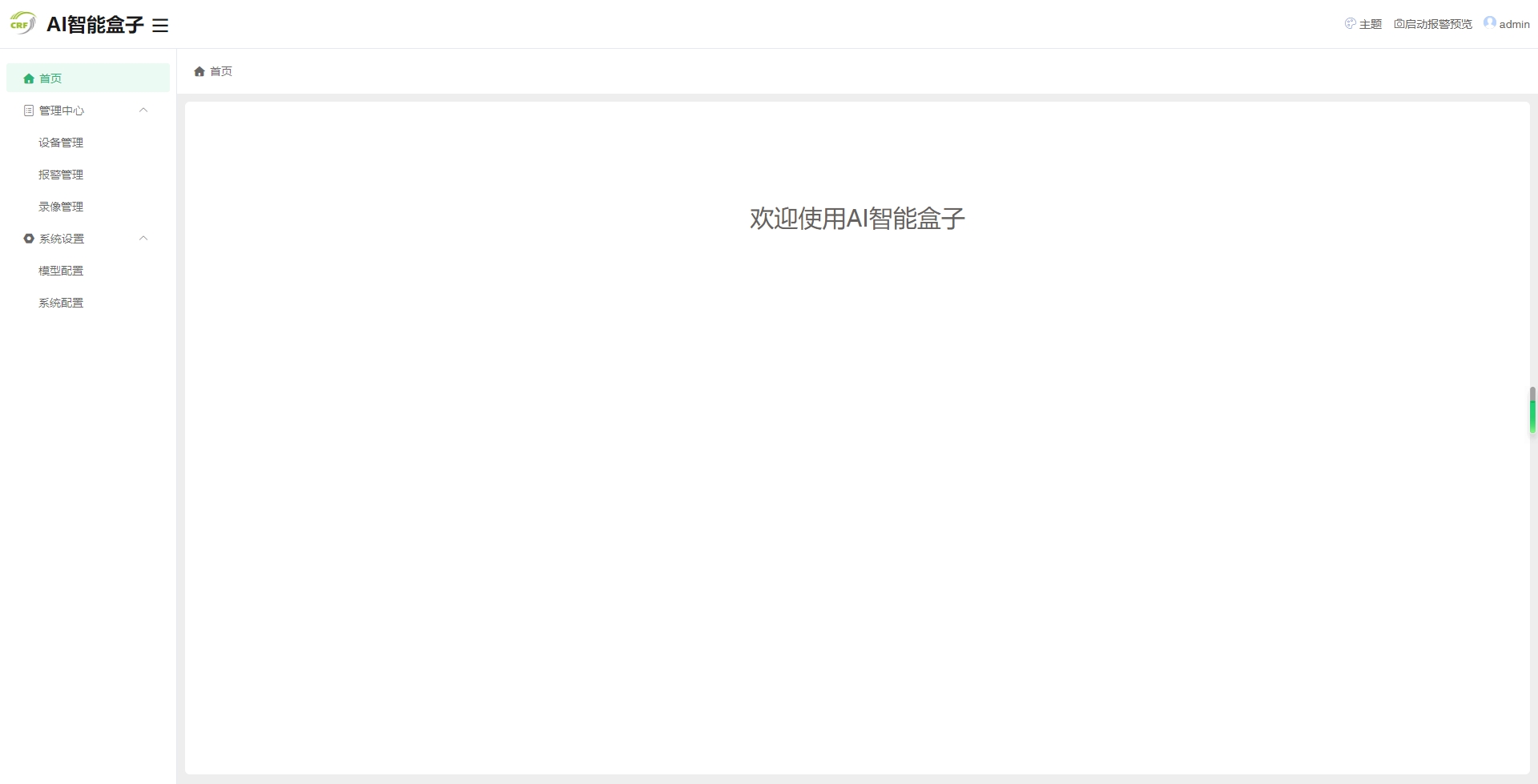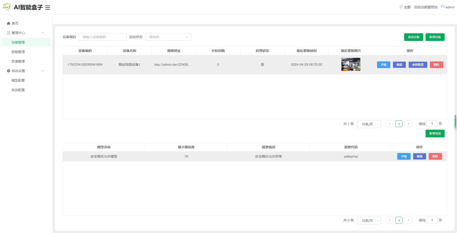 资源国际化 为适应不同用户的需求,AI盒子web管理端提供了中文简体、中文繁体、英文3种语言的切换。 模型管理 管理端提供模型管理功能,包括模型上传、模型添加、模型修改、模型删除、模型更新等功能,具体见演示效果。 设备管理 管理端提供了设备管理功能,包括设备添加、更新、移除、查询、设备区域范围配置、图片预览等功能。 场景管理 管理端提供指定设备的多场景管理,包括一个设备添加多个场景、查询设备场景、更新设备场景、移除设备场景功能。 系统配置 可以通过web端动态配置AI盒子的常用配置,包括盒子编码(对接第三方唯一id)、盒子保存数据天数、是否展示识别标签、第三方平台推送地址等。 重启盒子 如果有必要,可以通过web端重启AI盒子(linux下部署时候需要root权限部署才能正常重启,启动后自动启动AI盒子服务程序)