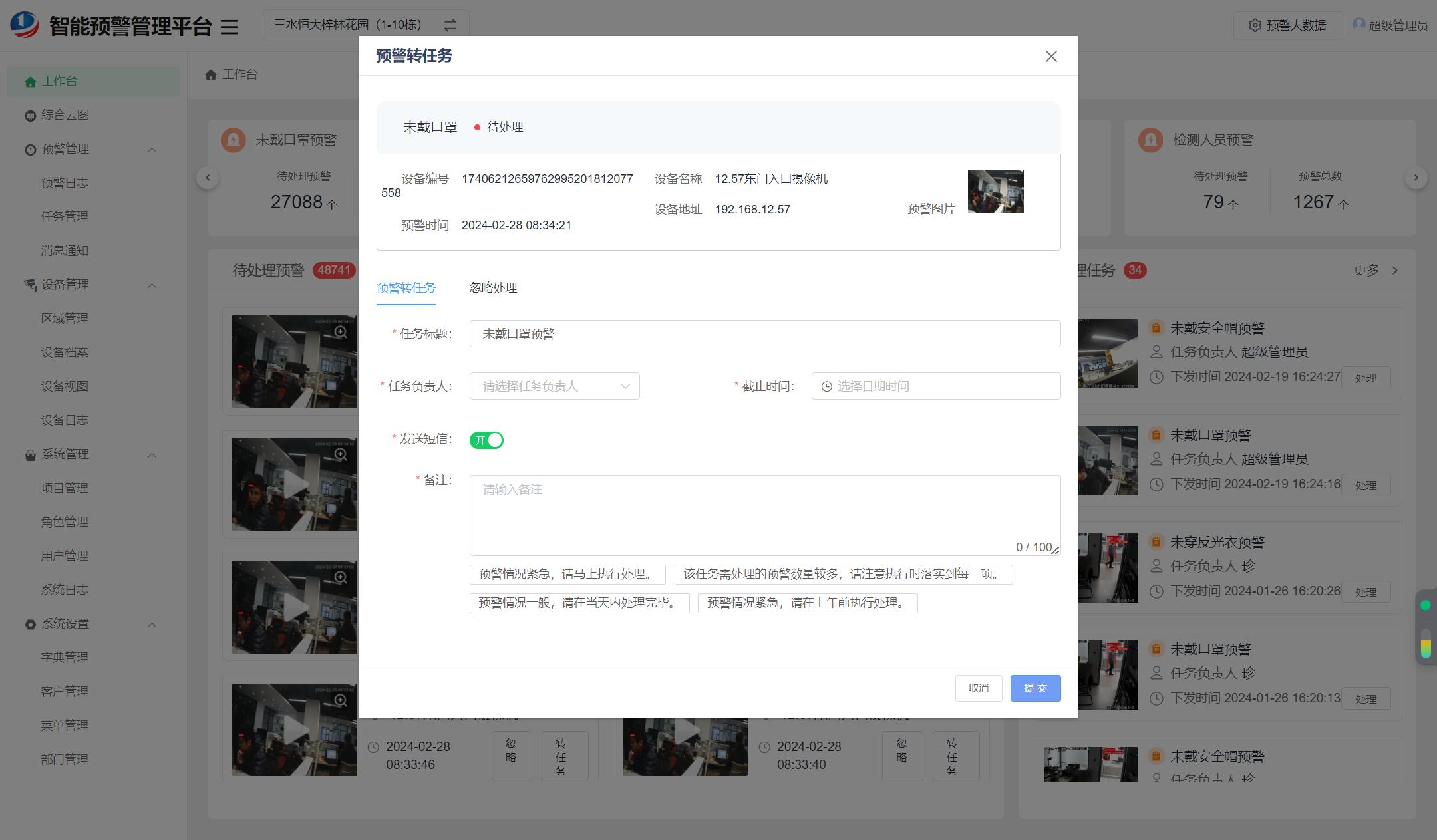 技术架构开发技术(1)C++版本 C++11 里面使用了一些C++11以上的新语法,对于老程序员来说,语言只是一种工具,花时间熟悉一下新语法即可,问题不大。 Boost C++跨平台库,C++11中的大部分新特性都是来自Boost准标准库,但是还有很多新特性暂时并未引入到c++中,它可以跨平台编码,开发人员并不需要写一些预编译语法来适应不同平台,只需要一套代码即可实现所有平台,这就是它的优势,也是为什么C++新语法基本都出自它的原因。 mysql 系统涉及到的一些模型数据、设备、场景、报警、配置等数据的存储既可以使用mysql存储,也可以使用sqlite存储,根据自己需要,可以通过配置文件配置存储方式,唯一的区别是mysql需要安装数据库而已。 sqlite 同上,AI盒子数据存储支持使用sqlite存储,所以需要用到sqlite库。 oatpp 一个开源的支持多语言的成熟http库,跨平台,支持DTO数据封装、SSL等,一个非常不错的HTTP协议库。 spdlog 一个开源的系统日志库,支持控制台打印、文件日志打印、支持自动清理、按日存储等功能。 opencv 一个很关键的一个库了,python使用pt模型,c++使用onnx模型,这里就是基于跨平台opencv来加载onnx模型实现推理的。 vue2.0 AI盒子提供了一个web管理端,通过其实现模型管理、设备管理、场景管理、报警管理、录像管理、系统配置、预警监控等功能。 注:此开源版本提供基于vue2.0开发的web管理端,提供与AI盒子内部通信的交互操作控制台,如果需要定制自己的模型、设备、场景、配置等,可能需要修改web后台管理端源码,需要此部分的源码,需联系作者付费采购,感谢理解。