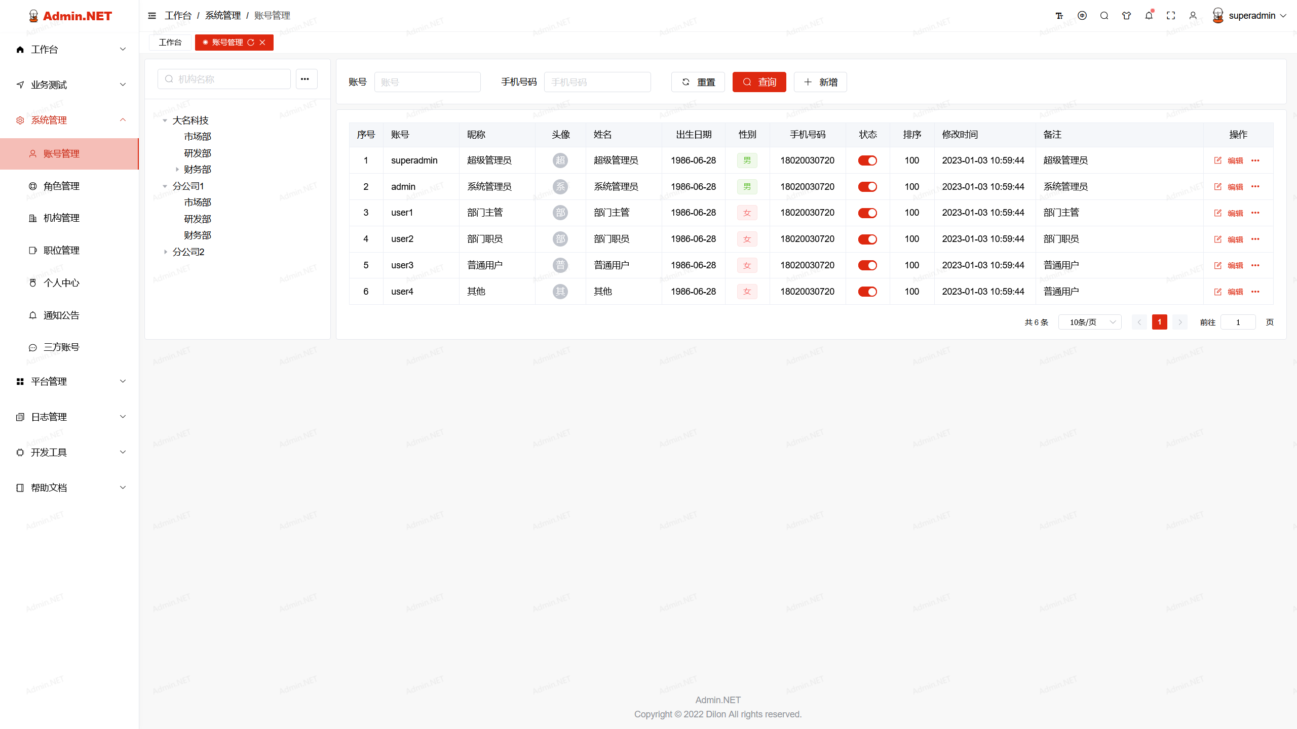 - 机构管理:公司组织架构维护,支持多层级结构的树形结构。
