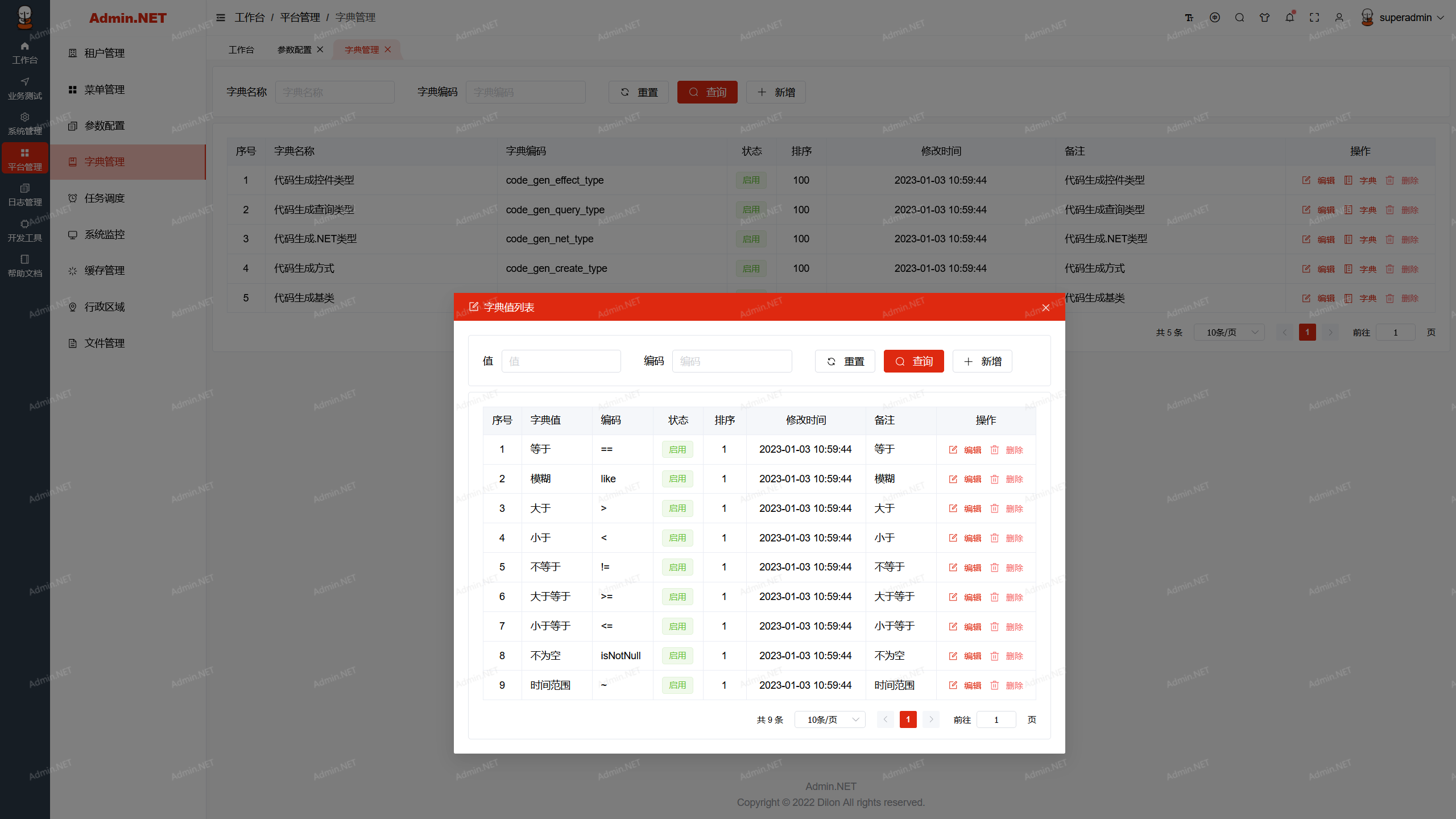 - 代码生成:可以一键生成前后端代码,自定义配置前端展示控件,让开发更快捷高效。