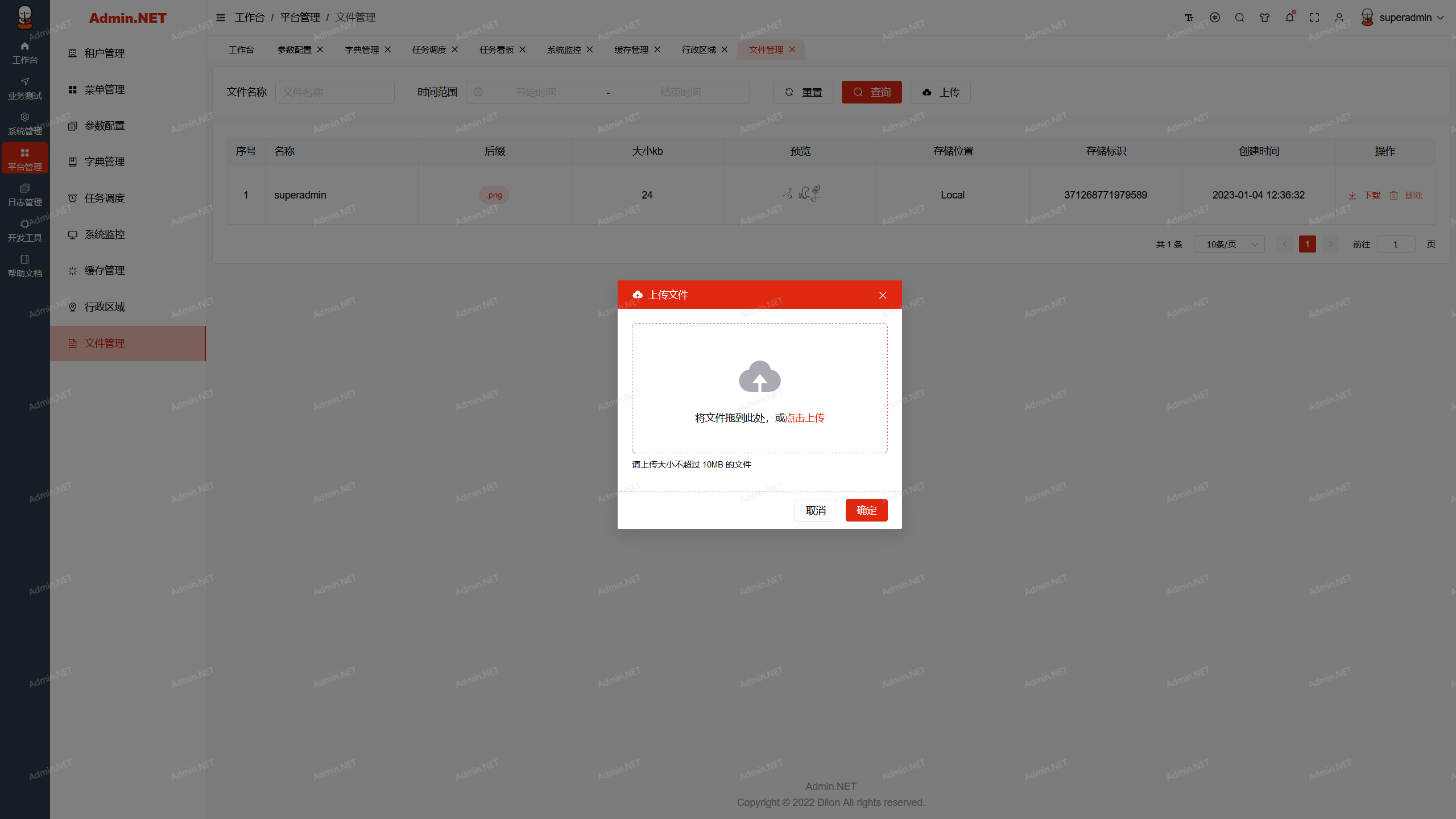 - 文件管理:文件的上传下载查看等操作,文件可使用本地存储,阿里云oss、腾讯cos等接入,支持拓展。