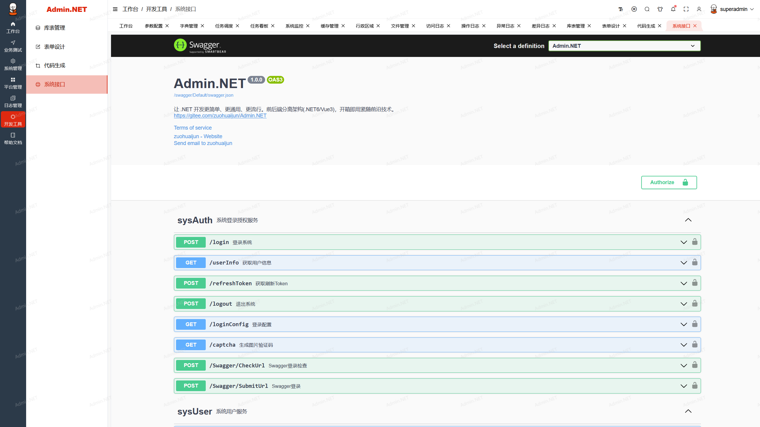 基于 .NET6 (Furion/SqlSugar) 实现的通用权限开发框架,前端采用 Vue3+Element-plus+Vite5,整合众多优秀技术和框架,模块插件式开发。集成多租户、缓存、数据校验、鉴权、事件总线、动态API、通讯、远程请求、任务调度、打印等众多黑科技。代码结构简单清晰,注释详尽,易于上手与二次开发,即便是复杂业务逻辑也能迅速实现,真正实现“开箱即用”。 面向中小企业快速开发平台框架,框架采用主流技术开发设计,前后端分离架构模式。完美适配国产化软硬件环境,支持国产中间件、国产数据库、麒麟操作系统、Windows、Linux部署使用;集成国密加解密插件,使用SM2、SM3、SM4等国密算法进行签名、数据完整性保护;软件层面全面遵循等级保护测评要求,完全符合等保、密评要求。 超高人气的框架(Furion)配合高性能超简单的ORM(SqlSugar)加持,阅历痛点,相见恨晚!让 .NET 开发更简单,更通用,更流行!
