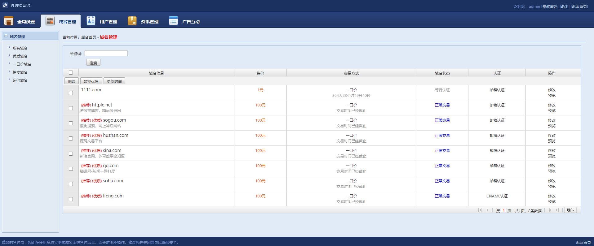 最新修复版域名出售交易平台源码,搭建即可正常使用,后台功能测试正常,前台测试正常