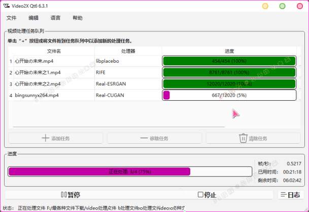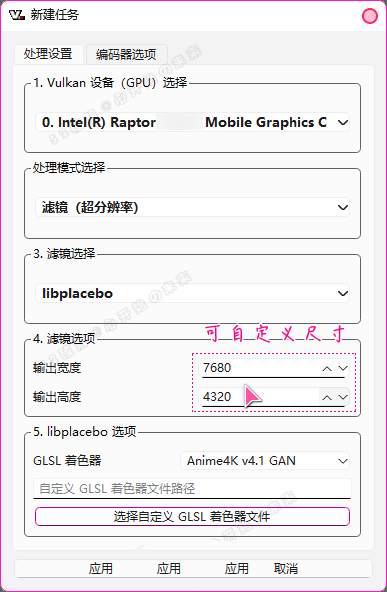 绿色版解压后双击 video2x-qt6.exe 运行即可打开 GUI 界面,可批量(拖动)导入文件任务后自动弹出处理设置界面,自行根据实际情况选择对应的显卡处理器、引擎或自设放大倍数或自定义输出文件尺寸(不同分辨率对应的尺寸自行搜索便知),静等结果输出会有系统提示音,原本导入的文件在哪则在哪输出。
