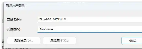 配置ollama的模型存储路径,默认是C盘,这里我们更改ollama的模型存储为D盘,先打开电脑的D盘创建一个名为“ollama”的文件夹。然后接上面弹出来的对话框中输入变量名和变量值: