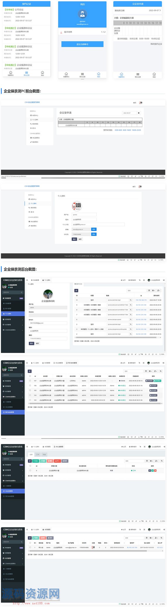 CSM会议室预约是一款手机可申请的会议室预约系统,适合企业版用户 这个是一款适支持手机端、电脑端可以申请的会议室预约管理系统,适合企业版用户; 系统后台提供了会议室的管理功能,用户可以手机端和电脑端来预约会议室。 功能特点: 1.会议室可以设置会议室预约免审批和需审批,大型的VIP会议室可以设置为需审批,小型的会议室可设置为免审批; 2.用户申请可通过手机微信、钉钉或者浏览器访问 3.用户可通过邮箱自助注册,如果是企业防止用户外部用户注册, 后台可以通过限制邮箱的后缀来屏蔽外部用户注册。避免管理员大量的维护人员信息和入离职的人员调整。 4.在会议室门口可摆放大屏幕,投屏会议室的当天会议室预约情况。这样方便参会人员可自行找到会议室。 没有 安装同thinkphp,上传,新建并导入数据库,修改application下的database.php 数据库连接信息,设置tp伪静态,设置public为运行目录,