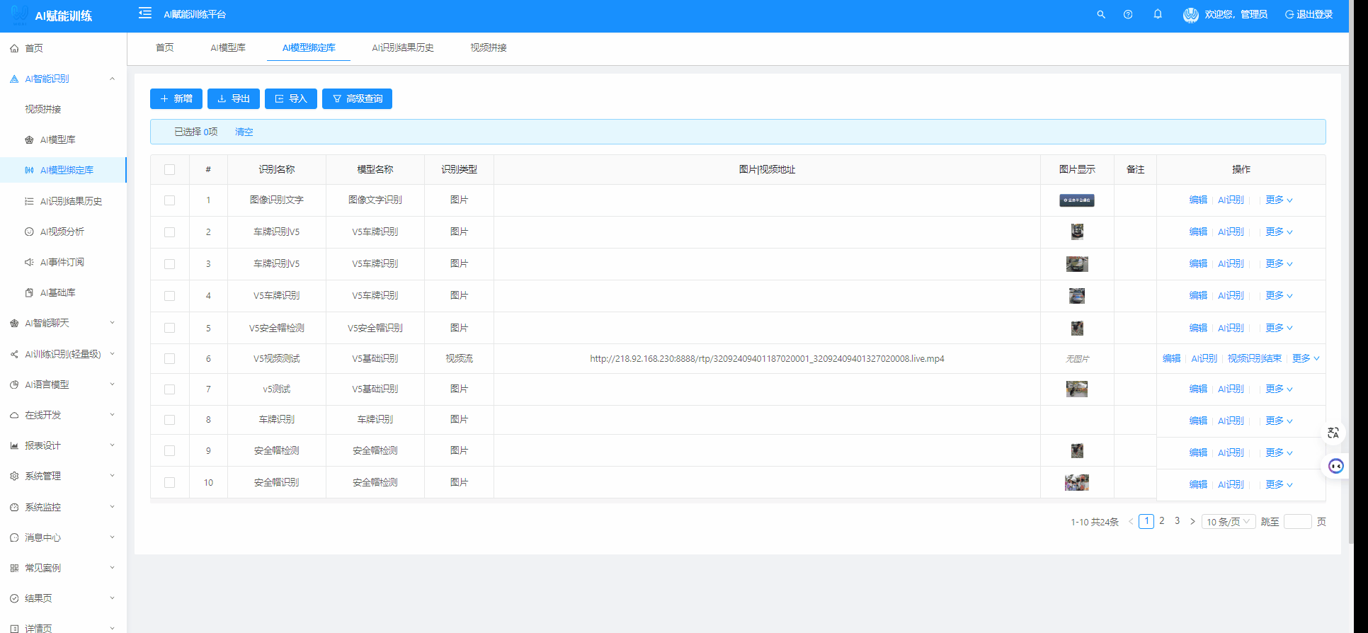 模型库绑定支持图片上传、图片地址、视频地址、rtsp、rtmp、flv、fmp4、不支持静态mp4播放,但支持识别;因为播放器控件不允许静态文件播放