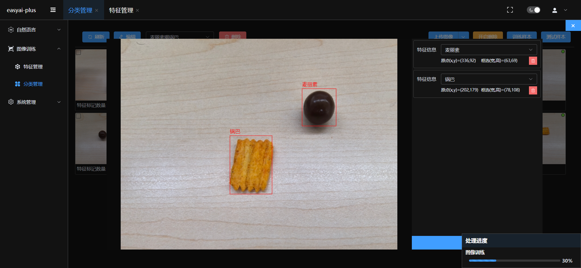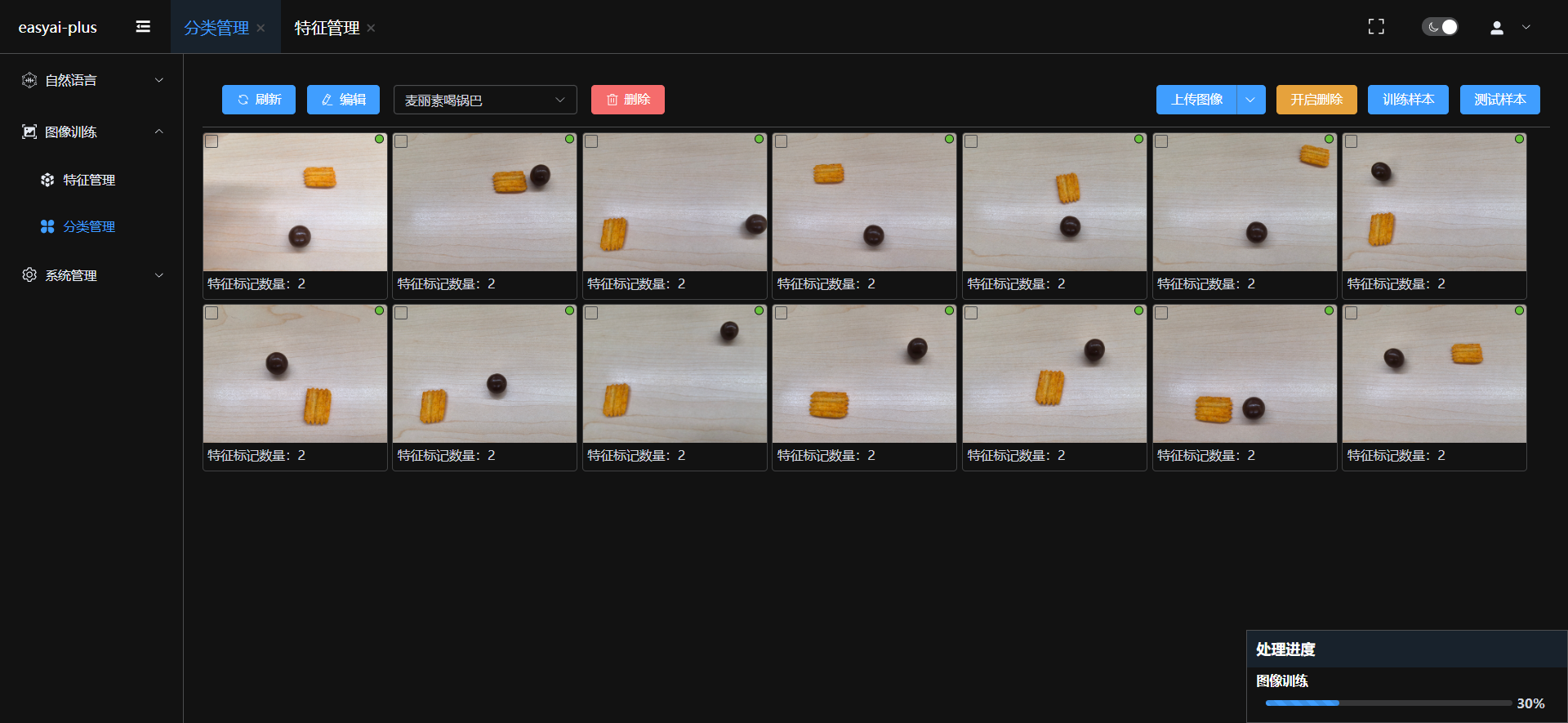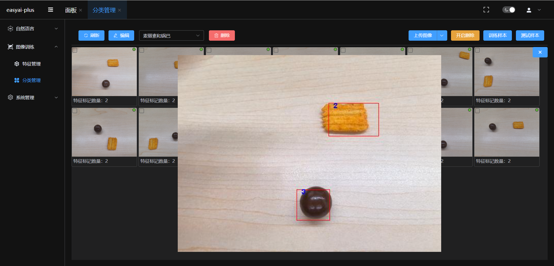- 图像训练-分类管理:管理分类下的所有图像,对图像可以进行手动标注,训练,和测试训练结果