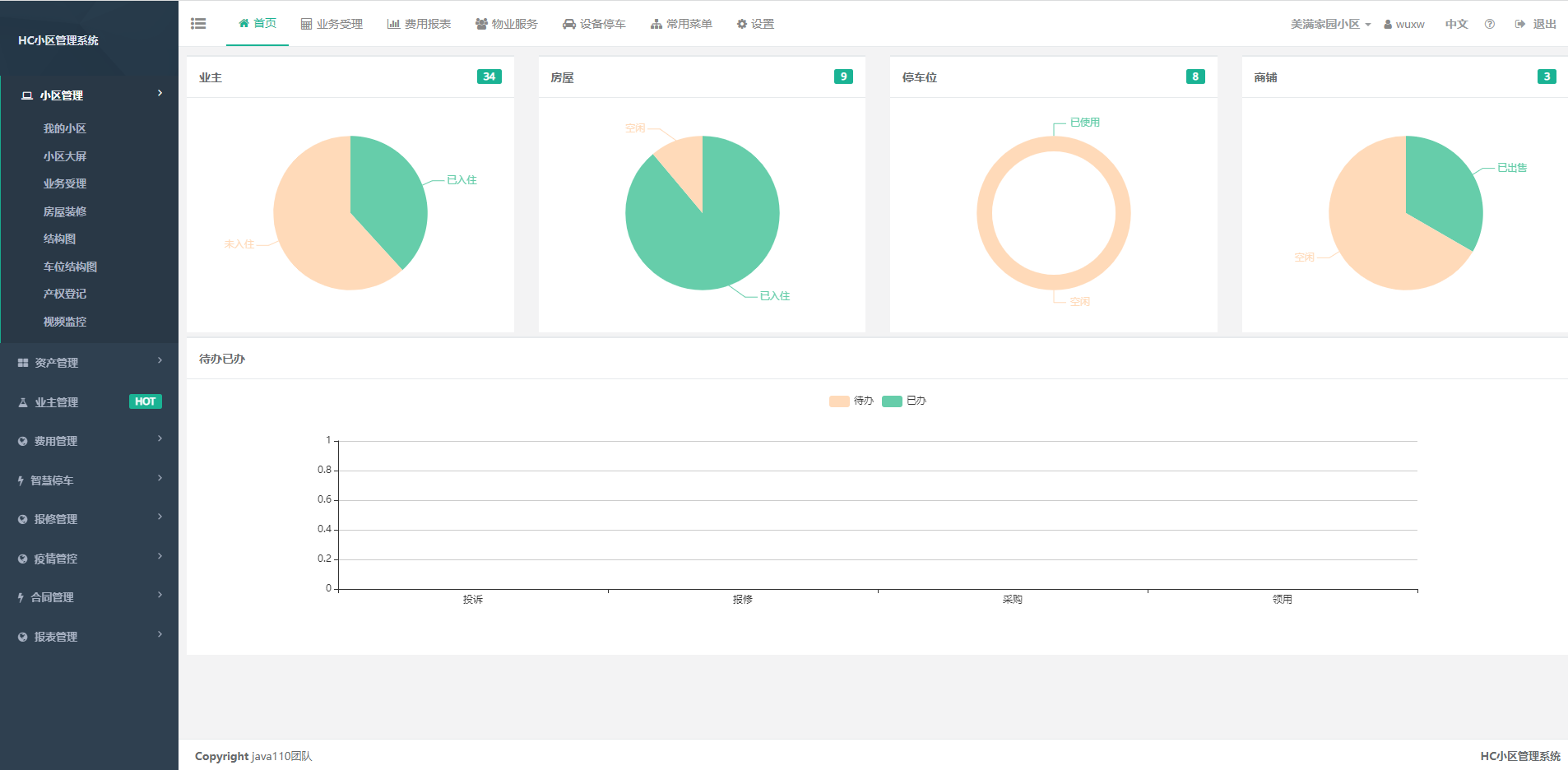 小区管理系统是一套saas物业管理的系统,包括 房产、业主、 费用 (可以线上缴费)、报修(可以线上报修)、投诉建议、采购、巡检、停车、门径、道闸、监控、工作流、问卷和公告等功能。