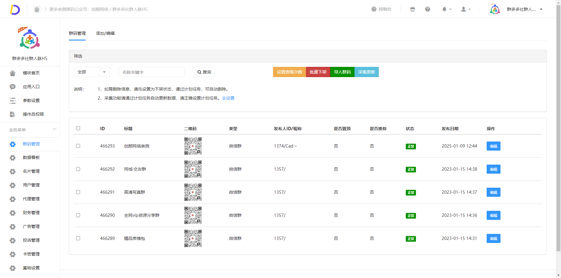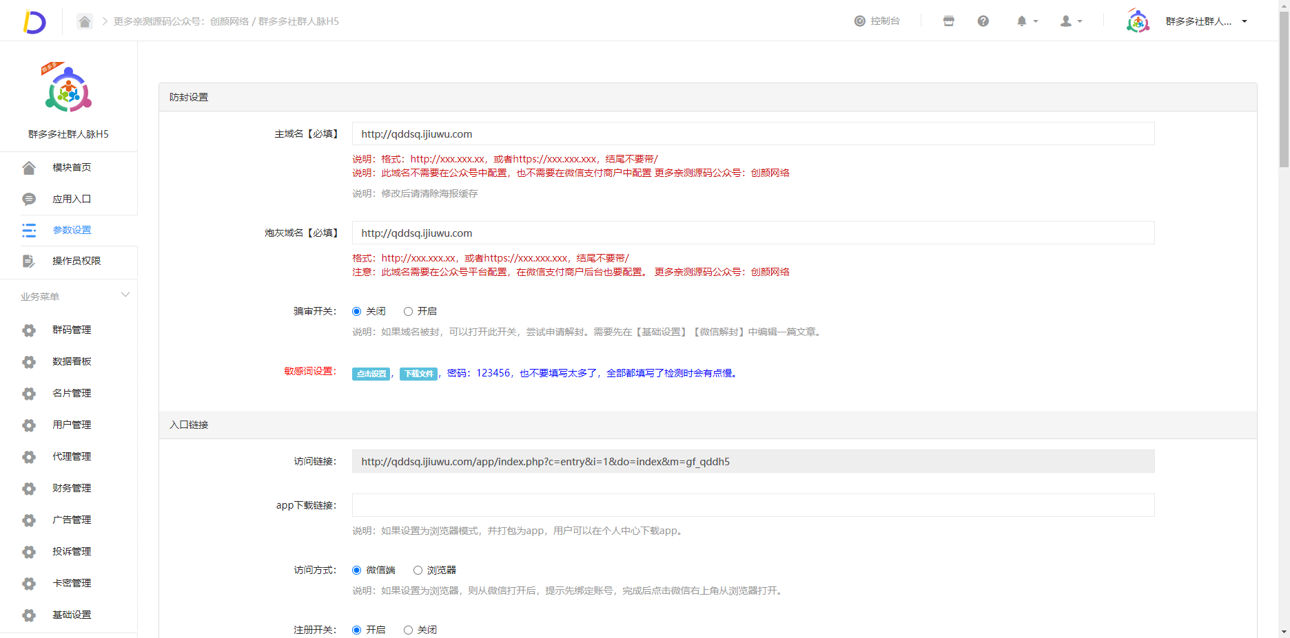 登录后台-平台管理-进入公众号-群多多社群人脉h5应用-参数设置-访问链接为前台链接