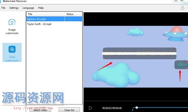 步骤3:选择水印区域 突出显示左侧列表中导入的图像/视频,并使用鼠标在右侧窗口中选择水印区域。您可以调整其大小,将其移动到您想要的任何位置,或通过单击红色的“X”图标将其删除。对于购买此软件的用户,可以选择多个水印。