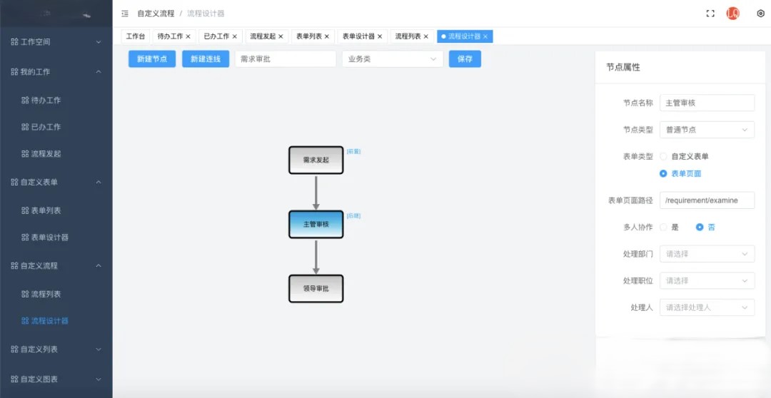 - 工作流节点可配置处理部门、处理职位及处理人任意一项或多项,系统自动寻找相关处理人,若三项都未配置,则系统根据提交人额定部门职位自动匹配相关处理人。
