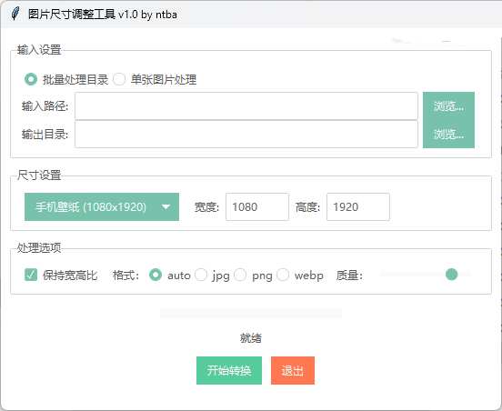 功能说明:可批处理,可单张,以指定尺寸进行输出,同时可调输出图片的质量。解决日常上传图片时大小不符合的问题。