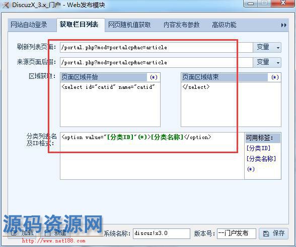 这里填写的页面一般都是发布文章的页,可以通过查看发布页面的源代码找到刷新列表部分的源码来获取栏目ID的规则。