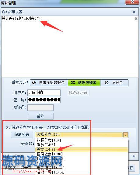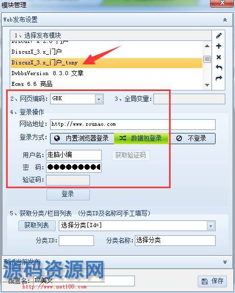 ▼发布模块保存后,回到在线发布管理界面,这里要选择网页编码,根据自己的网站编码来选择。这里登录操作还要填写网站地址,登录方式,小采这里是选择了数据包登录,即填写有发布权限的用户名和密码。填写完毕之后我们点击获取栏目分类进入下一步。