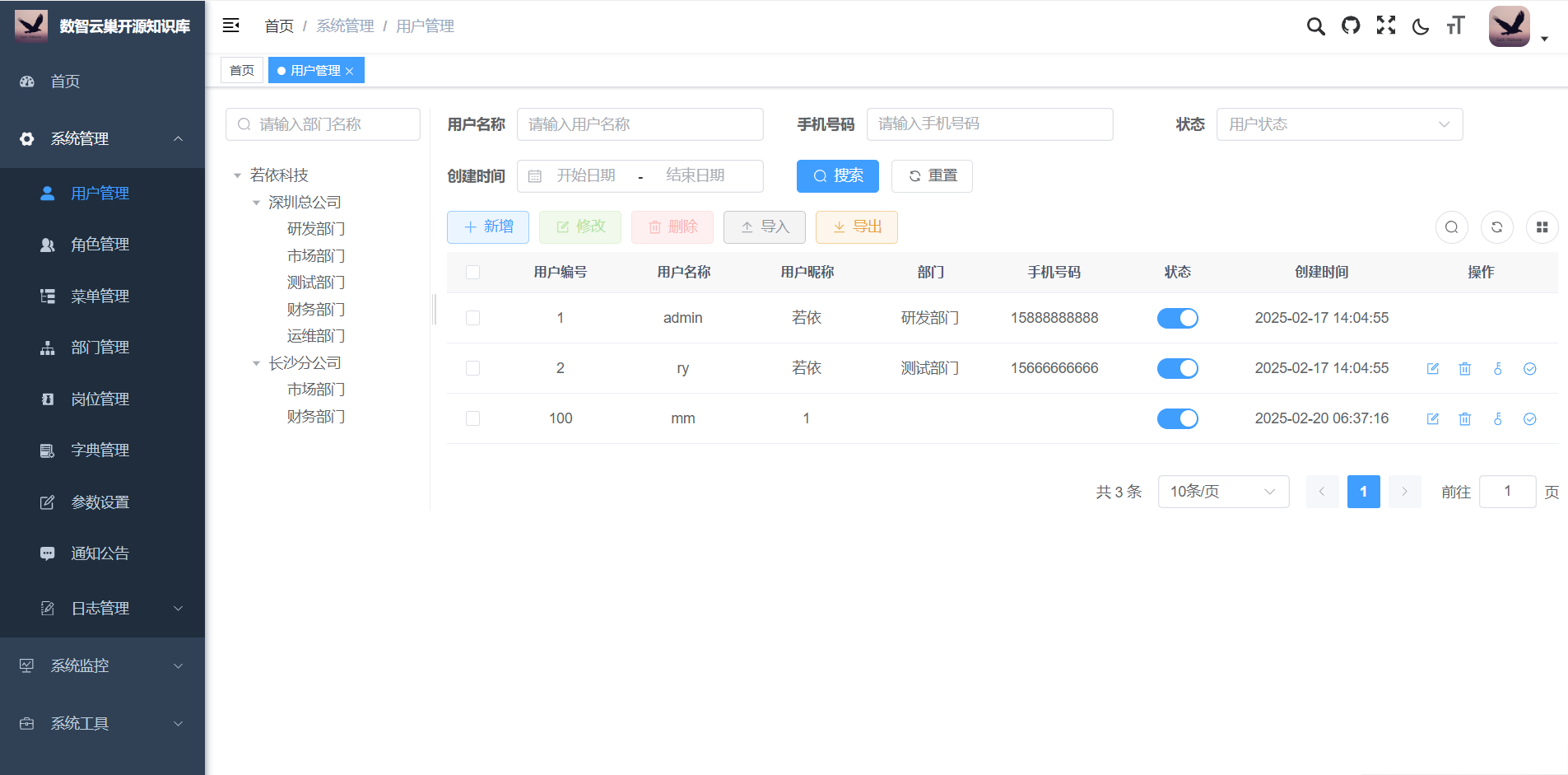 功能列表[td]| 一级功能 | 二级功能 | 版本号 | | 首页 | | V1.0 | | 数智平台 | 数智对话 | V1.0 | | 系统管理 | 用户管理 | V1.0 | | 角色管理 | V1.0 | | 菜单管理 | V1.0 | | 部门管理 | V1.0 | | 岗位管理 | V1.0 | | 字典管理 | V1.0 | | 参数设置 | V1.0 | | 通知公告 | V1.0 | | 日志管理 | V1.0 | | 系统监控 | 在线用户 | V1.0 | | 定时任务 | V1.0 | | 数据监控 | V1.0 | | 服务缓存 | V1.0 | | 缓存列表 | V1.0 | | 系统工具 | 表单构建 | V1.0 | | 代码生成 | V1.0 | | 系统接口 | V1.0 | | 文档管理 | 文档录入 | V1.0 | | 文档向量化 | V1.0 |