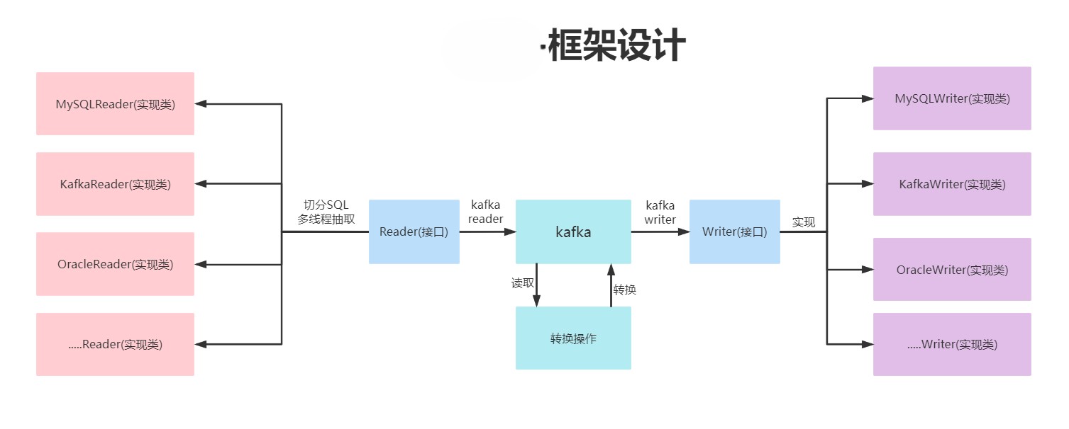 可以将多种数据库之间的数据互通和集成,实现将多种数据的迁移,脱敏,聚合操作。 支持的数据库列表[td]| 数据库名称 | 读插件 | 写插件 | | clickhouse | 支持 | 支持 | | db2 | 支持 | 支持 | | dm(达梦) | 支持 | 支持 | | doris | 支持 | 支持 | | elasticsearch | 支持 | 支持 | | hdfs | 支持 | 支持 | | hive | 支持 | 支持 | | kafka | 支持 | 支持 | | kingbase | 支持 | 支持 | | mysql | 支持 | 支持 | | oracle | 支持 | 支持 | | pg | 支持 | 支持 | | sqlserver | 支持 | 支持 | | starrocks | 支持 | 支持 | 框架设计