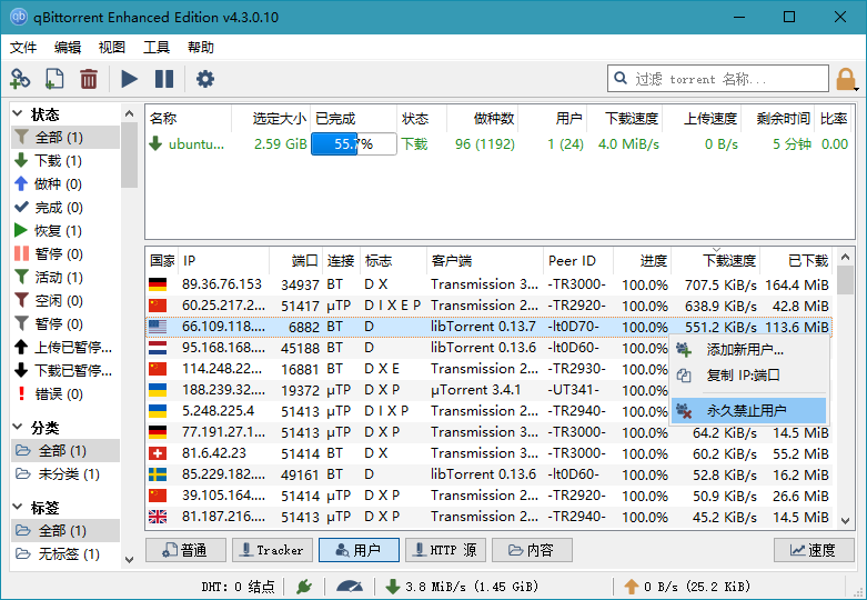 2、增强提供了IP过滤规则高级功能,可以根据需要在选项自定义选择 tracker
