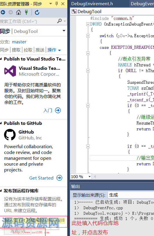 提交之后回到团队资源管理器的主页中,然后选择同步在地址栏中填入仓库的地址,并点击发布