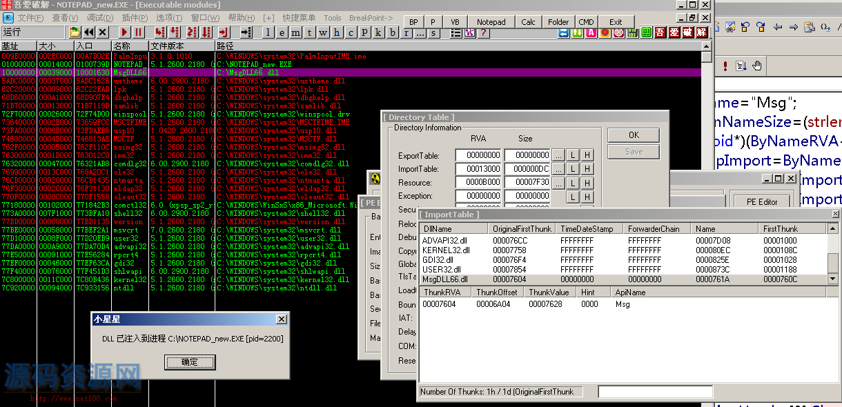 用LordPE工具加载在输入表里也看到了我们自己写的dll