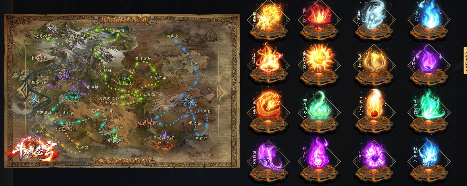 黑角域→魔炎谷→黑皇宗→黑盟→迦南学院→迦南内院 →天池→魂殿岛 异火地图 → 天焚炼气塔 隐藏地图 → 岩浆世界 → →古帝洞府 →古帝广场(终极地图)