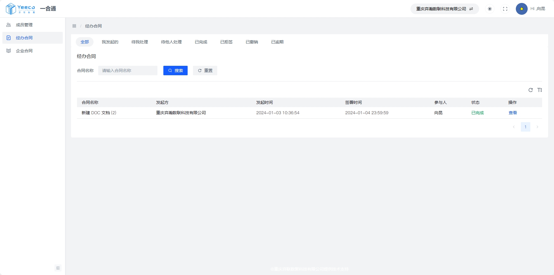 同时Web端还能根据合同签署的状态“我发起的”、“待我处理”、“待他人处理“、”已完成“、“已拒签”、“已撤销”、“已逾期” 进行查询