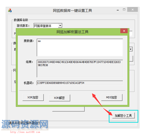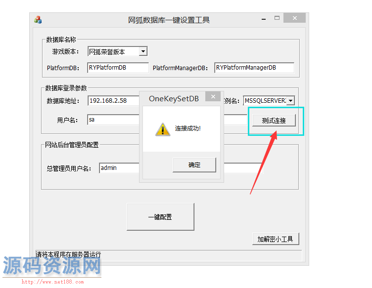 二. 点击 一键配置,便可配置好数据库数据,本软件还有网狐专用的加解密小工个,可以方便喜欢手动配置的玩家。