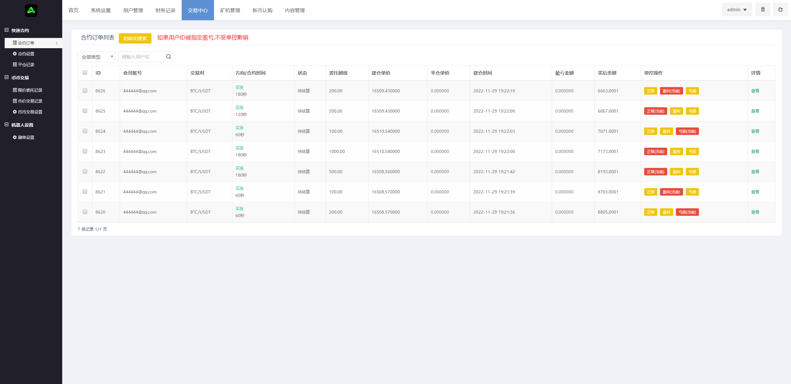 附更新文档: 总后台: 管理员后台新增今日充值和今日提现统计 后台新增了操作用户余额的功能,可以增加或扣除用户余额,增加会加到充值记录和账变记录,减少则只在账变中体现 充值记录可以筛选是管理员充值还是用户自己充值的 新增了禁止用户交易开关 新增了指定用户必赢、必输、正常赔付模式 修复后台添加用户会重复的问题 合约单控由下拉框改为按钮,且显示当前控制状态 充值和提现记录加入时间筛选 认购币可以配置每日涨幅 购买合约订单后台订单可以看到用户买过之后余额方便控单 新增用户列表显示总代是谁 新增充值币种配置为一个总代一个收款地址,后台设置默认充值地址,没有设置代理专用充值地址的,使用默认地址。设置代理专用充值地址的,则该代理下面的所有代都使用这个专用地址进行充值。 修复邮箱验证码接口,可以使用163邮箱或其他邮箱的smtp端口发送验证码邮件 优化了总代推定逻辑 系统原来的逻辑如果删除用户就只删除用户,用户的钱包、账变、订单记录、客服聊天记录,充值提现记录都不会自动删除,导致新注册的用户刚注册就有余额、订单记录等数据 优化了控单逻辑,原来开启自动按照风控比例设置订单盈亏是一打开,后台单控就失控了,现在不会了,现在只有订单结束时才会按照比例设置订单盈亏订单未结束,管理员都有机会控单,而且现在会随机设置订单盈亏了。 后台新增客服消息提醒 后台新增合约订单语音提醒。 用户充值,系统自动监听收款地址到账自动上分(无需对接API),且在后台可以查看TRC交易详情,无需去钱包查看收款记录,开启计划任务即可。简单,便捷。 后台可以生成USDT收款地址(比钱包安全),可以一键自动归集所有收款地址的余额到指定账户。 系统可以区分是系统用户,还是正式玩家 一键补充矿工费 一键归集USDT