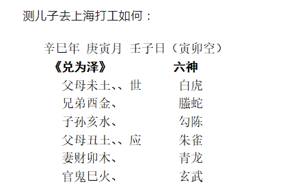 断析: 这是父测子的卦,儿子外出打工,因其年龄小,父亲不放心。他担心什么,无疑一个是安全问题,第二个便是儿子的财运。其中最主要的还是担心儿子的安全问题,我心里就是这样盘算着。 心中已有主测目标,那就细审卦情。兑为泽,为六冲卦,卦逢六冲,凡事不利。逢冲则散。又因其是去上海打工,上海在南方,为午火之地,卦象受克,这是反映了不利的信息。 世爻代表测卦人,因为是测儿子的事,世爻又了代表儿子,应爻为儿子所去的目的地。世应相冲,丑未相冲,世临白虎,受冲主血光之灾。再者,初爻官鬼巳火临玄武凶煞,处月生旺地而生世爻未土,是鬼来生身,又是凶灾的信息。 此外,卦中最明显、最重要的一条是官鬼巳火用神冲子孙亥水。目前,子孙亥水有日辰帮扶,而官鬼巳火在月受生,又子孙亥水克官鬼巳火,亥水用神略占上风还无大碍。但是,假如到了巳月,官鬼巳火当令掌权,而子孙亥水到巳月处绝地,必受官鬼巳火之反克,到时只怕有不幸事件发生。 再看财爻卯木,财爻卯木月帮日生处旺地,五爻兄弟酉金虽然能冲克妻财卯木,但酉金处休囚之地,反被木伤,又子孙原神旺而生财,看来财上还是很不错的。只怕财气太旺,反而促使财旺伤身。 结果:四月二十三日下午两点多钟他去上班,在路上被一辆摩托车撞倒在地,当场昏迷,头部受重伤,后脑骨断裂,胸腔积水差点送了命,花了两万多元。