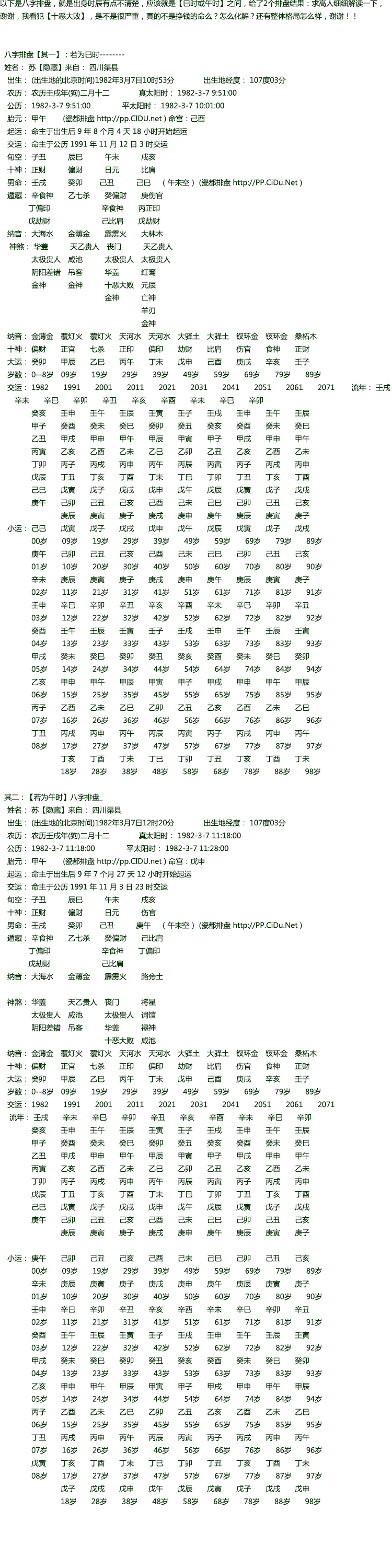 最全八字神煞排盘:八字排盘怎么看?出生公历:1990年1月18日13时7分(北京时间),星期四。免费八字排盘查神煞。 出生农历:己巳年 十二月 廿二日 未时。八字排盘神煞不一样。 杀 才 日元 杀 乾造 己 丁 癸 己 (日空申、酉) 巳 丑 未 未 藏干 庚丙戊 癸辛己 乙己丁 乙己丁 印财官 比枭杀 食杀才 食杀才 地势 胎 冠带 墓 墓 纳音 大林木 洞下水 杨柳木 天上火八字神煞排盘元亨。 节气:小寒:1990年1月5日22时34分,立春:1990年2月4日10时14分。 起大运周岁:4岁 2个月 12天,每一交大运年 3月 30日起运(公历)。四柱八字神煞排盘。 排大运: 财 食 伤 比 劫 枭 印 杀 大运 丙子 乙亥 甲戌 癸酉 壬申 辛未 庚午 己巳八字神煞大运排盘。 临官 帝旺 衰 病 死 墓 绝 胎 岁数 5 15 25 35 45 55 65 75有详细神煞的八字排盘。 年份 1994 2004 2014 2024 2034 2044 2054 2064八字神煞排盘周易网。 排流年: 始于 甲戌 甲申 甲午 甲辰 甲寅 甲子 甲戌 甲申 1 乙亥 乙酉 乙未 乙巳 乙卯 乙丑 乙亥 乙酉 2 丙子 丙戌 丙申 丙午 丙辰 丙寅 丙子 丙戌 3 丁丑 丁亥 丁酉 丁未 丁巳 丁卯 丁丑 丁亥 4 戊寅 戊子 戊戌 戊申 戊午 戊辰 戊寅 戊子 5 己卯 己丑 己亥 己酉 己未 己巳 己卯 己丑 6 庚辰 庚寅 庚子 庚戌 庚申 庚午 庚辰 庚寅 7 辛巳 辛卯 辛丑 辛亥 辛酉 辛未 辛巳 辛卯三藏八字神煞排盘。 8 壬午 壬辰 壬寅 壬子 壬戌 壬申 壬午 壬辰八字排盘神煞怎么看。 9 癸未 癸巳 癸卯 癸丑 癸亥 癸酉 癸未 癸巳 止于 2003 2013 2023 2033 2043 2053 2063 2073 ※胎元:戊辰(大林木) 命宫:癸酉(剑锋金)八字神煞在线排盘。 终身卦:(用年干起)八字神煞大全精解。 干支: 己巳年 丁丑月 癸未日 己未时 主变卦 坤为地(坤宫) 之 山地剥(乾宫) [空亡:申、酉] 白虎 ━ ━×子孙酉金 世 ━━━ 官鬼寅木 腾蛇 ━ ━ 妻财亥水 ━ ━ 妻财子水 世 勾陈 ━ ━ 兄弟丑土 ━ ━ 兄弟戌土四柱神煞排盘算命。 朱雀 ━ ━ 官鬼卯木 应 ━ ━ 官鬼卯木 青龙 ━ ━ 父母巳火 ━ ━ 父母巳火 应 玄武 ━ ━ 兄弟未土 ━ ━ 兄弟未土 吉神凶煞: 年柱 天乙 太极 驿马 地网 月柱 福星 华盖 日柱 童子 时柱 华盖 童子 星座:摩羯座。 生肖:蛇。 二十八宿:井。 命主福元:坤宫,属西四命。八字神煞速查及详解。 ※提示:神煞是八字预测中的一个附加信息,是吉是凶,要看神煞的喜忌而定,不能单凭神煞的性情论判。在八字中,能起到反映事情类型、性质的作用。※ 命局生克制化: ※五行个数(计入藏干): 2死水 2囚木 4休火 6旺土 2相金 五行个数(不计藏干): 1死水 0囚木 2休火 5旺土 0相金 五行力量:水22(5.8%) 木4(1.1%) 火78(20.6%) 土260(68.6%) 金15(4.0%) 己生助力量:37(9.8%) 克泄耗力量:342(90.2%)。 阴气:330(87.1%) 阳气:49(12.9%)。四柱神煞 在线查询。 ※日主综合得分:-269。 日元极弱,命局入从杀格(以变格论命),喜用土,火(官杀、财星)。忌仇水,金(比劫、印枭)。 癸水生于丑月,土旺、金相、火休、木囚、水死。 生于寒冷冬季,八字可适当借火调候。 调候用神:丙、丁,火成局,须庚辛。 ※此命局入七杀格。入从杀格(变格)。神煞查法及解释。 比肩 2位死(022,5.8%),劫财 0位死(000,0.0%),合计力量(022,5.8%) 食神 2位囚(004,1.1%),伤官 0位囚(000,0.0%),合计力量(004,1.1%)八字算命。 偏财 3位休(048,12.7%),正财 1位休(030,7.9%),合计力量(078,20.6%)太极贵人。 七杀 5位旺(252,66.5%),正官 1位旺(008,2.1%),合计力量(260,68.6%) 偏印 1位相(004,1.1%),正印 1位相(011,2.9%),合计力量(015,4.0%) ※天干无合。地支有丑未月日相冲,丑未月时相冲。论日坐十二长生。 ※提示:这一步给出了整个八字最有价值的信息,用数量化表示,容易理解把握,论命者要有意识的综合利用这些数据,切记!※天乙贵人。 三命通会论断:八字神煞排盘。 ◆癸日己未时生,是鬼旺身衰的命。癸以己为官,时柱上有明暗二己适得地利,而癸水无气,浑浊不清,如果通月制又不通水气的,衣禄一般。 ◆癸未日己未时生,生于春月,偏官得到适当制伏,以吉命论。生于夏日,衣禄平常。生于秋冬两季,自身健旺。生于申月,行木运,命主贵显。生于巳年或辰年,官至六卿。 ※提示:单以日时论命显然有失偏颇,但给出的断语可以为分析八字起提醒的作用,经典名著自有它的深意。※ 穷通宝鉴-调侯用神参考:四柱神煞在线查询。 癸日丑月生(丙、丁) (1)五月时,癸水极寒,天地万物均不能生长,故急需有丙火作为其调候用神。若年时上有丙火透出,且有壬水,地支中戊土又多时,则可辅助阳光,可以功名显达。 (2)有丙而无壬时,土温水暖,为一俊秀之命,可得小贵。 (3)有王而无丙、戊时,土寒水冷,若调和之气时,需借他人之力才能发福开运。 (4)丙火显现,地支成为水局时,如太阳照湖,有水气上升之象,可富夸乡党。若无丙火,则为一生劳苦之命。 生辰排盘年柱国印啥意思(5)地支成火局,且有庚、辛透干时,为衣食充足之命。若无金性时,反变为孤贫之命。 (6)地支成木局时,泄水过多,易致疾病。若有金之救神时,可以技艺成功。 ※提示:这里对命局生克关系有较好的论述,不失为找用神的一个点醒之笔,给出了实际命例,论命者可对照研究。※ 十神定位论断: 年干为七杀,生非老大,上有兄姐,或贫困家庭。年支为正财,祖上富有,若再见正官,生于富贵家。 月干为偏财,父掌家权,或幼年为养子。月支为七杀,适于抛头露脸,出风头之业,若有合杀带羊刃者,或食神伤官制之者,当为贵命。 日支为七杀,配偶多半性